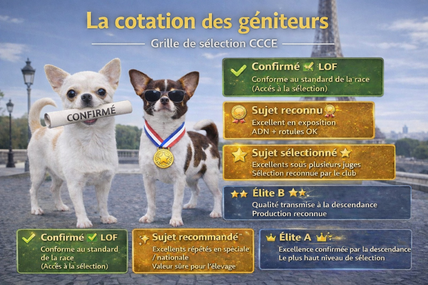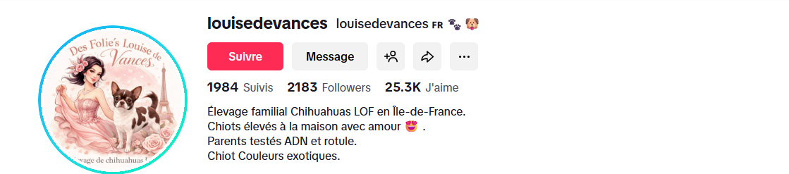 Liens Associations Clubs Divers Eleveurs SOCIETE CENTRALE CANINE https://www.centrale-canine.fr/ La Centrale Canine est l’organisme officiel français qui gère l’ensemble des démarches et outils liés aux chiens de race. Elle est notamment responsable du LOF (Livre des Origines Français), le registre qui certifie l’origine des chiens de race et garantit leur traçabilité et leur conformité aux standards reconnus. Sur le site de la Centrale Canine, vous pouvez : -Consulter ou enregistrer un chien au LOF et obtenir son pedigree ; - Accéder à des informations officielles sur les races, les expositions canines, les confirmations et standards ; - Accéder à des tests ADN et résultats de santé officiels enregistrés dans leur base ; - Trouver des services et ressources pour éleveurs, propriétaires et passionnés de chiens de race. -Ce site est une référence fiable et officielle pour comprendre la généalogie, les documents officiels et les démarches autour de l’élevage canin en France. ASSOCIATION CHIHUAHUA EN DETRESSE https://www.chihuahuaendetresse.fr/ L’élevage des Folie’s Louise de Vances apporte son soutien à l’association Chihuahua en détresse, qui œuvre pour la protection, la prise en charge et le placement de chihuahuas en difficulté. Sensibles au bien-être animal et aux valeurs de respect et de responsabilité, nous souhaitons ainsi contribuer, à notre niveau, à la cause du chihuahua et plus largement à la cause animale. CHIHUAHUA, DU COTON DE TULEAR ET DES EXOTIQUES https://www.ccce.org/ Notre élevage est rattaché au club de race officiel du Chihuahua (CCCE) , Vous y retrouvez toutes les informations officielles sur la race . La cotation des géniteurs Grilles de sélection du CCCE https://www.ccce.org/club/cotation_geniteurs.html Attention : Depuis le 1er juillet 2015, le sujet doit être identifié ADN. La présence de l'empreinte génétique du sujet concerné dans la base de données SCC est obligatoire pour la prise en compte de la cotation (voir la procédure sur le site de la SCC). Donc le CCCE ne peut pas enregistrer la cotation si l'empreinte ADN n'a pas été envoyée à la Centrale Canine. Merci de faire le nécessaire avant de demander la cotation de votre chien. Retrouvez nous sur Facebook https://www.facebook.com/profile.php?id=100081853390203 Découvrez notre page Facebook dédiée à l’élevage LOF de chihuahuas. Nous y partageons régulièrement photos et vidéos de nos chiens et de nos chiots, leur évolution au quotidien, la vie de l’élevage, ainsi que des conseils et informations autour de la race, dans le respect, la passion et le bien-être de nos chihuahuas. Suivez nous sur TIKTOK https://www.tiktok.com/@louisedevances?_t=8qgdmzRNYqe&_r=1&fbclid=IwY2xjawGBIhtleHRuA2FlbQIxMAABHXswVDhAZe1KieZkG3rH_MnEo9Ywh6j2gWsw4lV35qmQy143gF1gvRt2kQ_aem_qG8aNwGJAfiwWFiZPXF3sg Retrouvez notre page TikTok pour partager un moment convivial autour de l’univers du Chihuahua. Photos et vidéos de la vie quotidienne à l’élevage, instants de complicité, chiots et adultes, le tout dans une ambiance chaleureuse et authentique. Elevage partenaire - Du Grimoire Des Nains https://dugrimoiredesnains.chiens-de-france.com/chihuahua Je vous présente l’élevage « Du Grimoire des Nains », un petit élevage familial tenu par une amie éleveuse, où les chiens et chiots vivent à la maison, au plus proche de leurs maîtres. Les reproducteurs sont testés pour les rotules et identifiés par ADN.